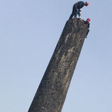 1、拆除烟囱高度达60米,第1层平台向上部分筒身为砖砌结构,筒身腐化严重,且顶口多处开裂,裂缝宽度4-10厘米不等,随时有崩塌危险,固采用人工拆除时需在烟囱顶部2米做加固处理,为避免较大震动人工拆除采用的工具主要为电锤,震动相对较小,进度相当缓慢,工作量巨大。