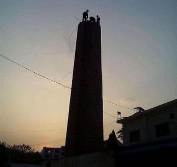 9、拆除工具使用电镐、大锤、凿子等工具,二人一组配合,以此类推往下拆除砖烟囱。