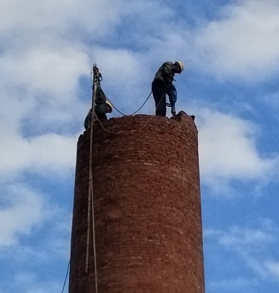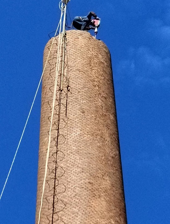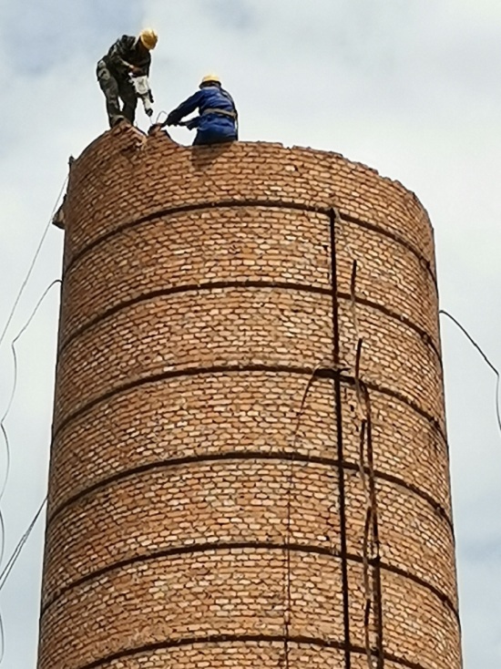 9、拆除工具使用电镐、大锤、凿子等工具,二人一组配合,以此类推往下拆除砖烟囱。