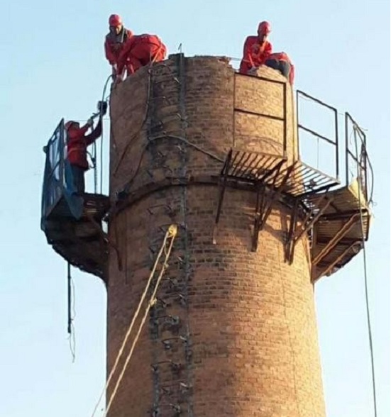 1、拆除烟囱高度达60米,第1层平台向上部分筒身为砖砌结构,筒身腐化严重,且顶口多处开裂,裂缝宽度4-10厘米不等,随时有崩塌危险,固采用人工拆除时需在烟囱顶部2米做加固处理,为避免较大震动人工拆除采用的工具主要为电锤,震动相对较小,进度相当缓慢,工作量巨大。