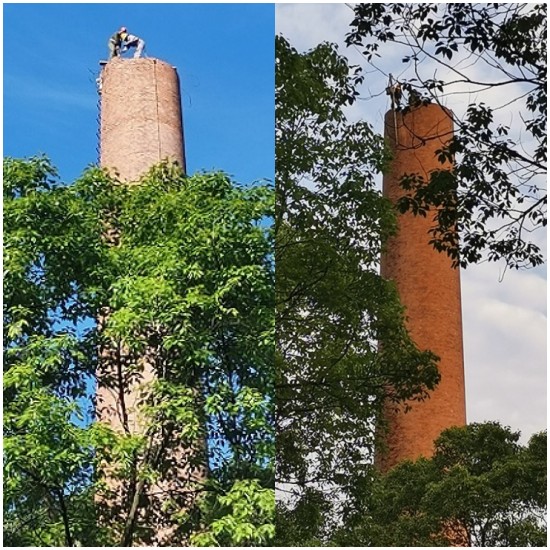 每一步都必须谨慎,还要保护好周围措施,配合业主,顺利拆除完烟囱