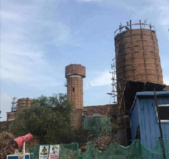 6、烟囱废砖渣运输:烟囱拆除到一半后,废砖渣进行外运,在旧砖渣外运时,为确保安全,烟囱拆除施工人员必须停止烟囱拆除,防止烟囱拆除下来旧砖渣向外崩溅。