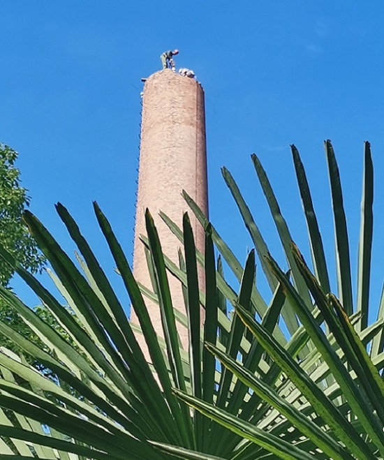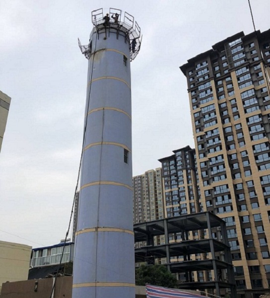 施工人员从烟囱外爬梯爬上烟囱顶部,将安全带挂在安全绳上,开始在烟囱直径对直的位置进行开U型槽,在顶口开凿4个U型槽深50CM宽15CM,将两根超出烟囱直径30CM的国标钢管用国标的扣件连接成十字架放置到凿开的U型槽里,再用钢管搭设小横杆固定在十字架钢管上,上面铺上2CM的脚手板,脚手板用铁丝固定好,根据烟囱直径的变化更换相应长度的搭设脚手架的钢管。烟囱顶口直径为1.5米脚手管用3米长的,依次向下移动,移动到10米位置时换4米的钢管,移动到30米位置换6米的钢管,烟囱底部直径在5米。