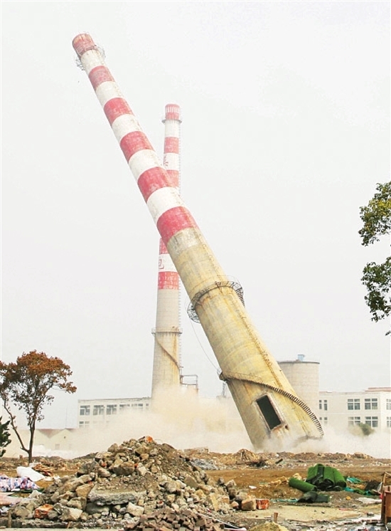 记者于11:00在另一处爆破现场看到,随着一阵巨响,河北兴泰发电有限责任公司4座高达105米的冷却塔,依次按照设计的位置轰然倒地。至此,兴泰发电公司6台20万千瓦机组冷却塔全部实施定向爆破,彻底告别历史舞台。